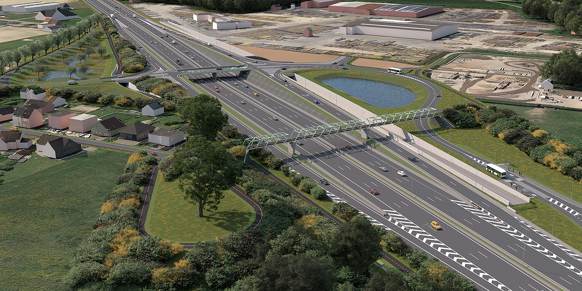 Het drukke kruispunt op de A12 in Londerzeel-Zuid wordt een multimodale mobiliteitsoplossing met een vernieuwd op- en afrittencomplex. Boven de snelweg verrijzen twee nieuwe bruggen: één voor lokaal verkeer en één voor actieve weggebruikers. Die laatste wordt een comfortabele, hellingsvriendelijke fietsverbinding die rechtstreeks aansluit op de fietssnelweg F28. Ons ontwerp zet in op minder materiaalgebruik en beter waterbeheer.