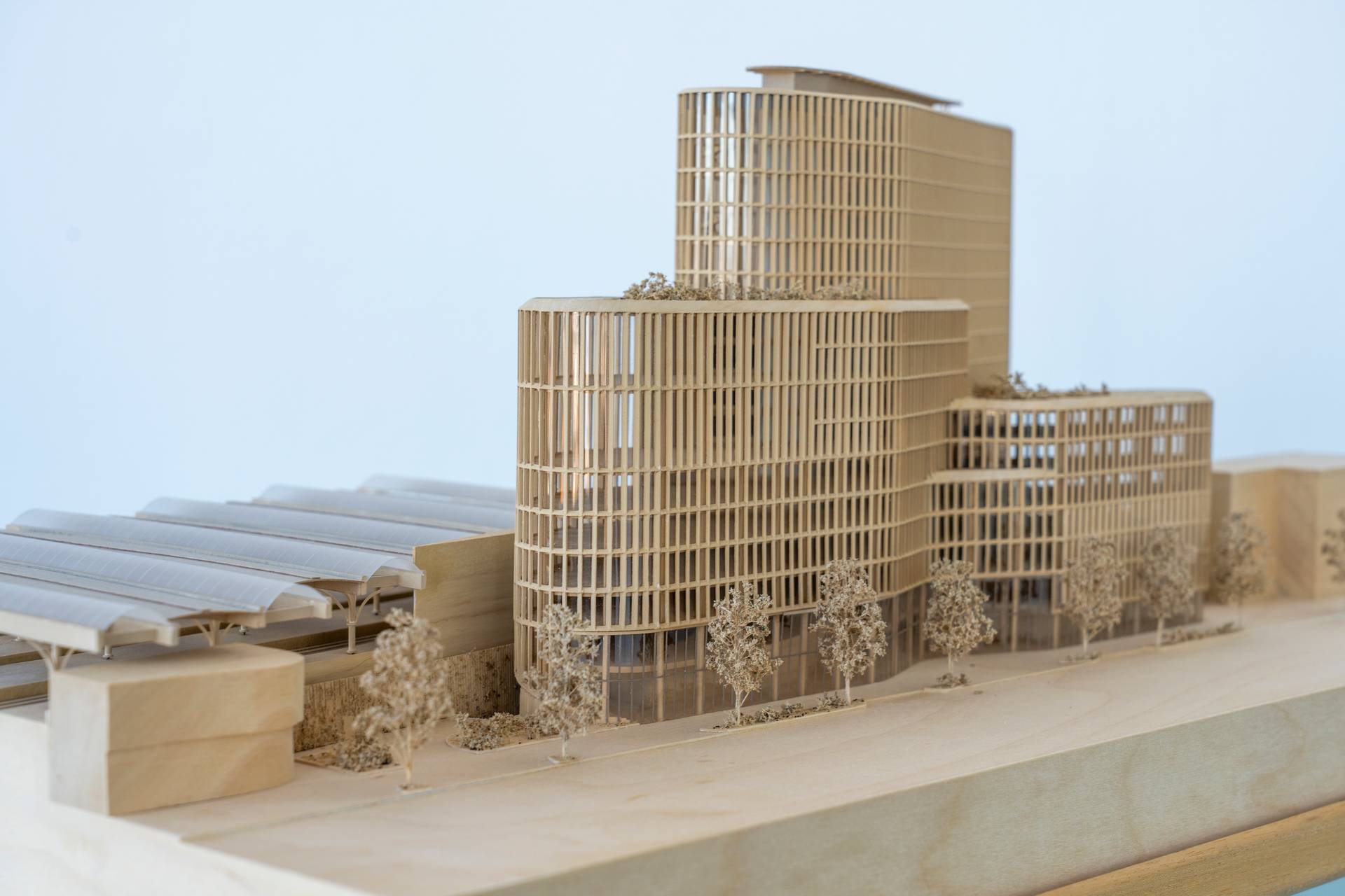 Met The Switch werken we mee aan een primeur in België: het allereerste hoogbouwproject met 14 verdiepingen in hout. De eerste twee niveaus worden uitgevoerd in beton. Dit wordt de nieuwe hoofdzetel en het controlecentrum van Infrabel. Een operationeel hart van 36 000 m², verdeeld over drie volumes waarvan de hoogste tot 60 meter reikt. We combineren betonnen kernen met CLT-vloeren (Cross Laminated Timber) en gelamineerde houten kolommen en liggers. Deze keuze verlaagt het gewicht, versnelt de montage en bespaart tonnen CO2.
