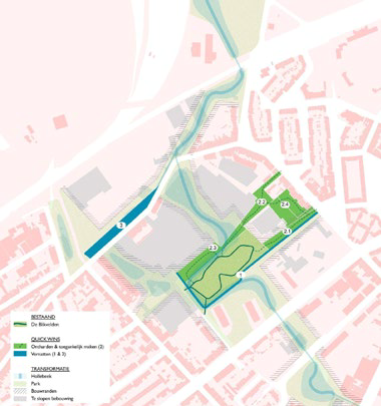 Ook landschapsontwerp en ecologie spelen hun rol. Tien hectare wordt ingericht als overstroombaar park waar water gebufferd wordt en biodiversiteit en ontmoeting floreren. De overige ruimte krijgt een mix van wonen, bedrijvigheid en publieke voorzieningen. Zo groeit een vervuilde plek uit tot een leefbare en weerbare wijk.